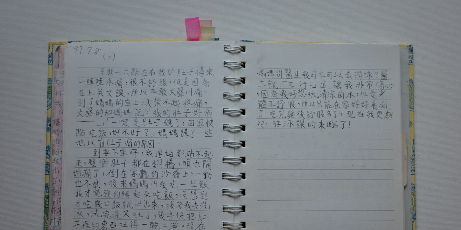 今天,媽媽帶我去看醫生,媽媽幫我問醫生可不可以去游泳?醫生說:「不行。」這讓我非常傷心,因為我好想玩清涼的水,但是身體不舒服,只能在家好好養病。吃完藥後舒服多了,現在我更期待游泳課的來臨了!