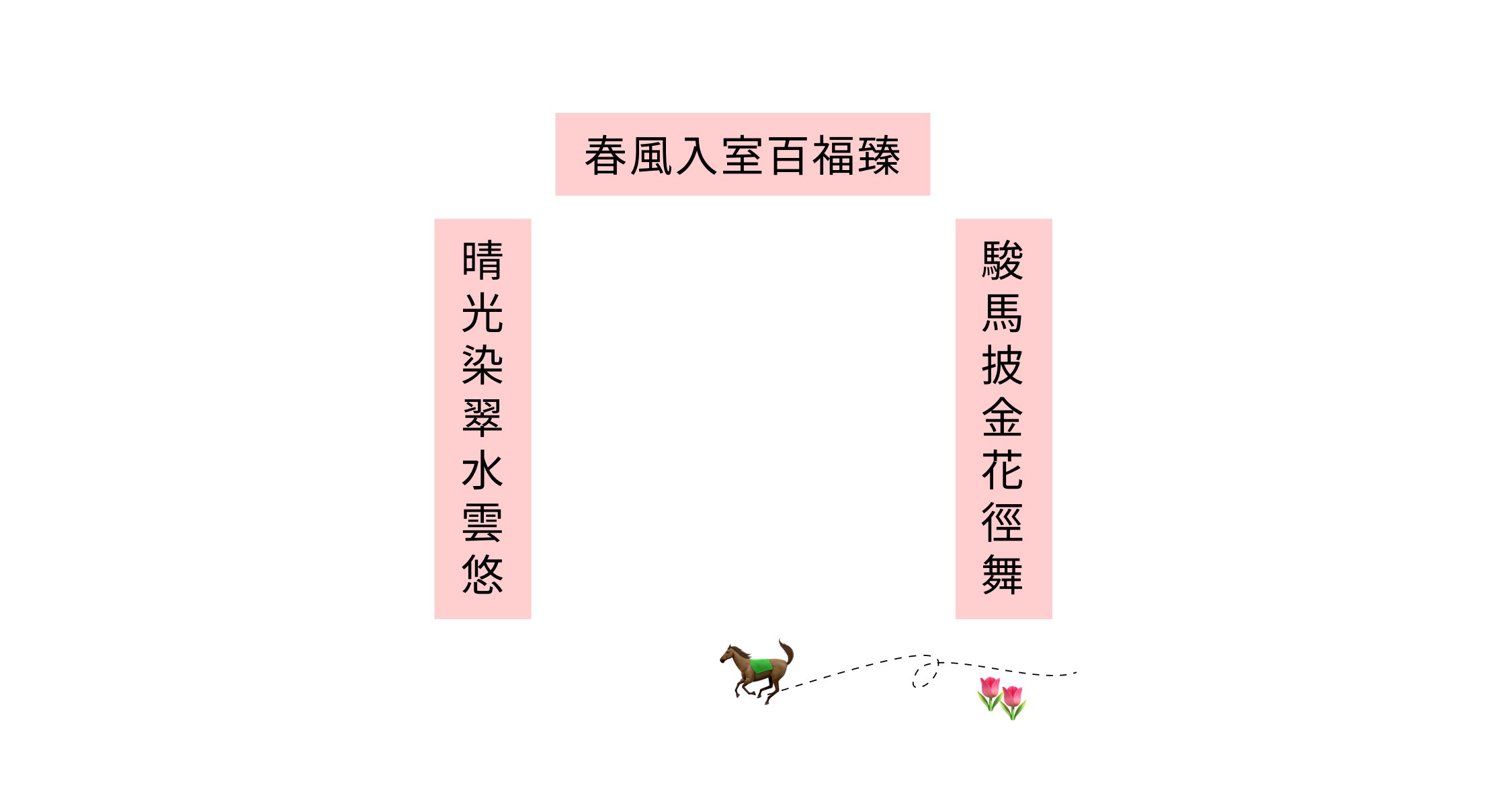 有別於以往,今年想在春聯加入生肖,「馬」字相對於其他生肖,字型優雅靈動。AI 已了解我厚愛清幽、自然的內容,再請他加入「金馬、駿馬」的奔騰與生機。不滿意就再請他重新生成,挑出喜歡的部分、剔除不喜歡的字眼,直到滿意。