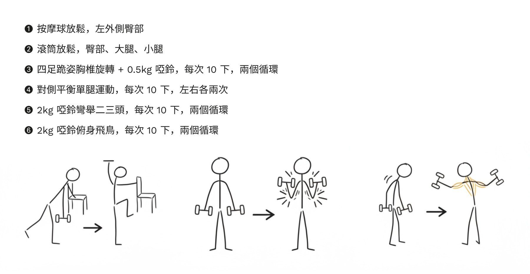 這個圖解清單的誕生,終於讓我每週自行訓練兩次。動作不難,畢竟現階段最重要的是「有個開始」,至少不要完全不動。接著每週透過課程,更新居家訓練清單。
